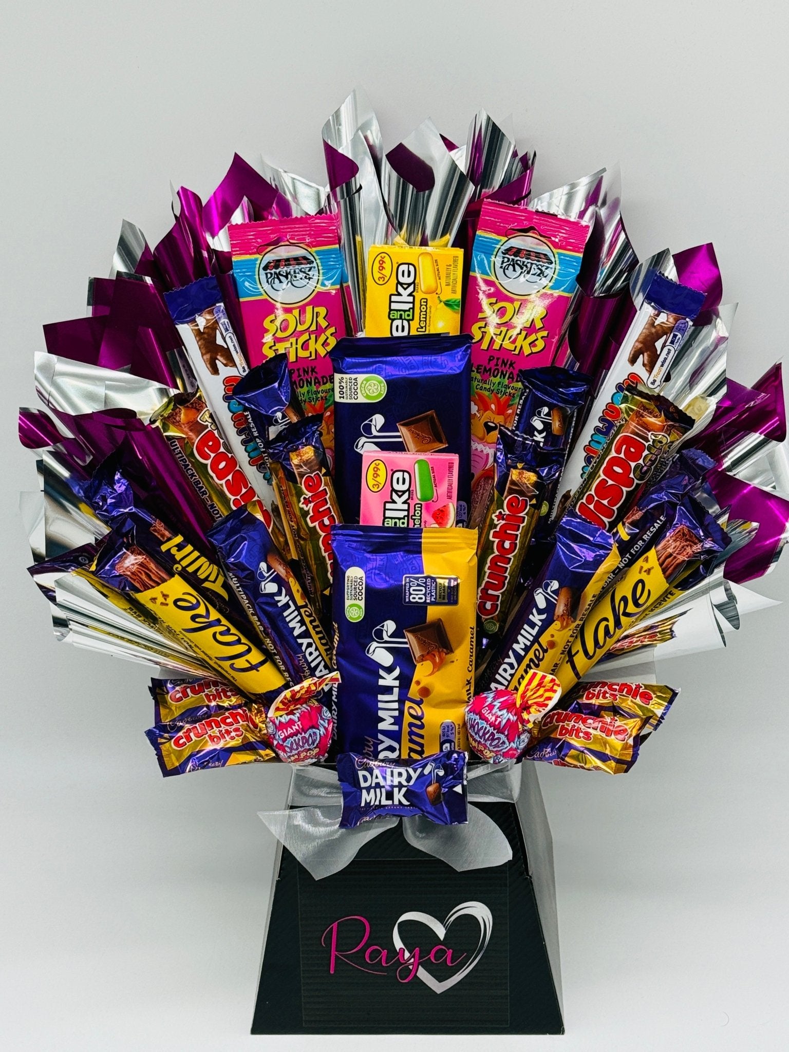 Are you looking for a special gift for a celebration? Our personalised chocolate bouquets are the perfect way to surprise a loved one. Select your favourite chocolates and add a name, message or logo to the front of the box and leave a short message on the back to give the sweetest of gifts. Beautifully arranged like a floral bouquet but better because its full of chocolate. Unlike flowers, these gorgeous bouquets are perfect for all celebrations as they are a great alternative to flowers because they look great for as long as they last (which might not be too long if you are a chocoholic). For any particular requests such a Dairy Milk only please select the closest option and then email with your order number.