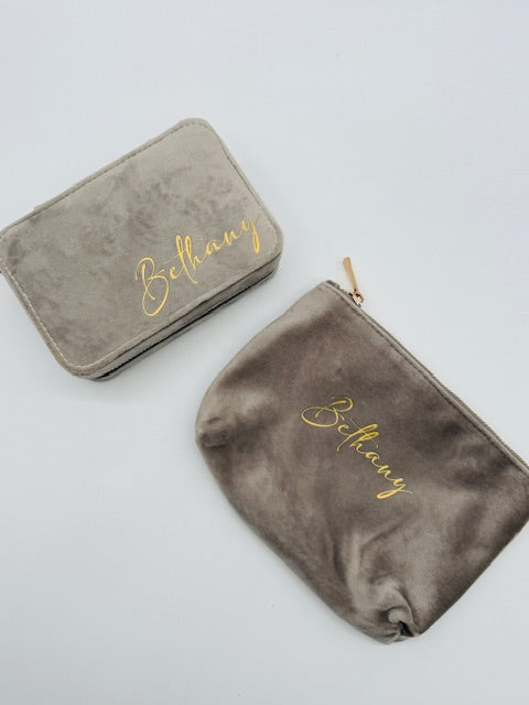 Meet The Velvet Set, a beautifully soft, personalised velvet jewellery case paired with a matching pouch designed to keep treasured pieces safe and organised. Made from plush velvet with a timeless feel, this elegant duo is perfect for storing rings, earrings, necklaces and bracelets at home or on the go. The structured jewellery case keeps everything neatly in place whilst the coordination pouch is ideal for travel or your bag.